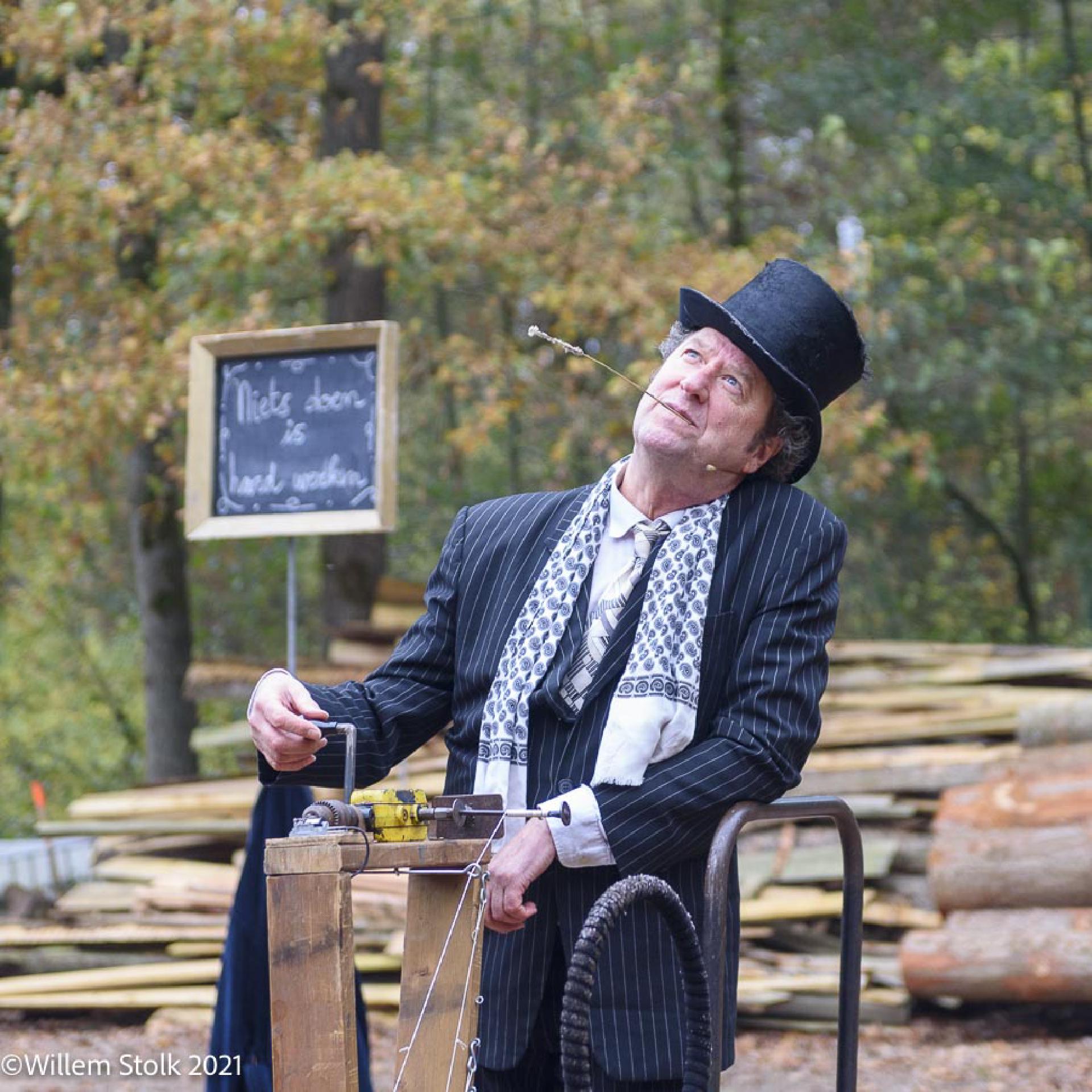 De wandelingen, waar zo’n 63 mensen aan deel namen, eindigden bij de houtschuur. Daar verzorgde theatermaker Pieter Post een act over het belang van tijd nemen voor de dingen die we doen, vooral ook om te leren het leven te vertragen. Dat is niet gemakkelijk in onze overhaaste maatschappij. ‘Nietsdoen is hard werken’, is één van zijn motto’s. De route en beschrijving van het pad vind je hier.